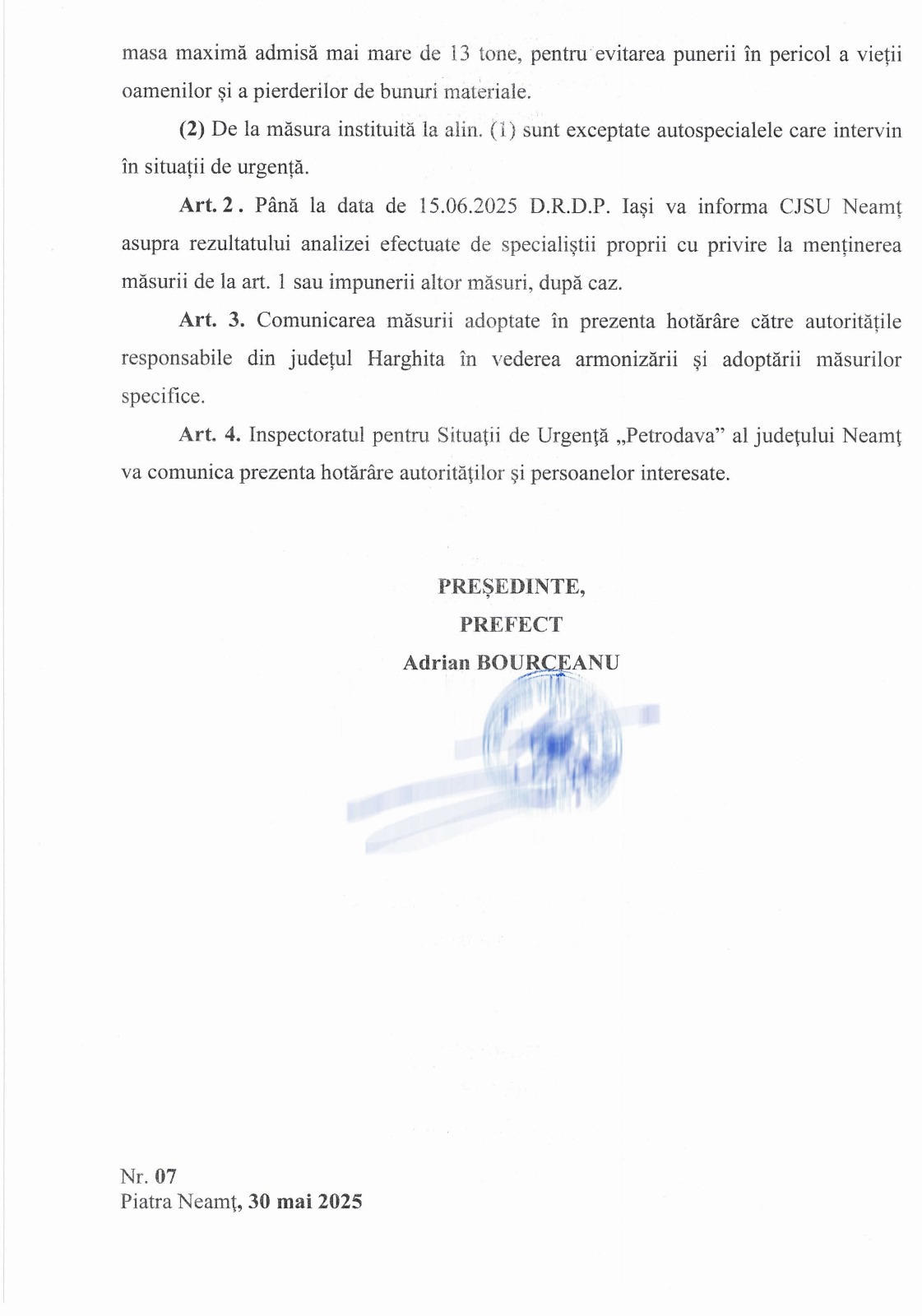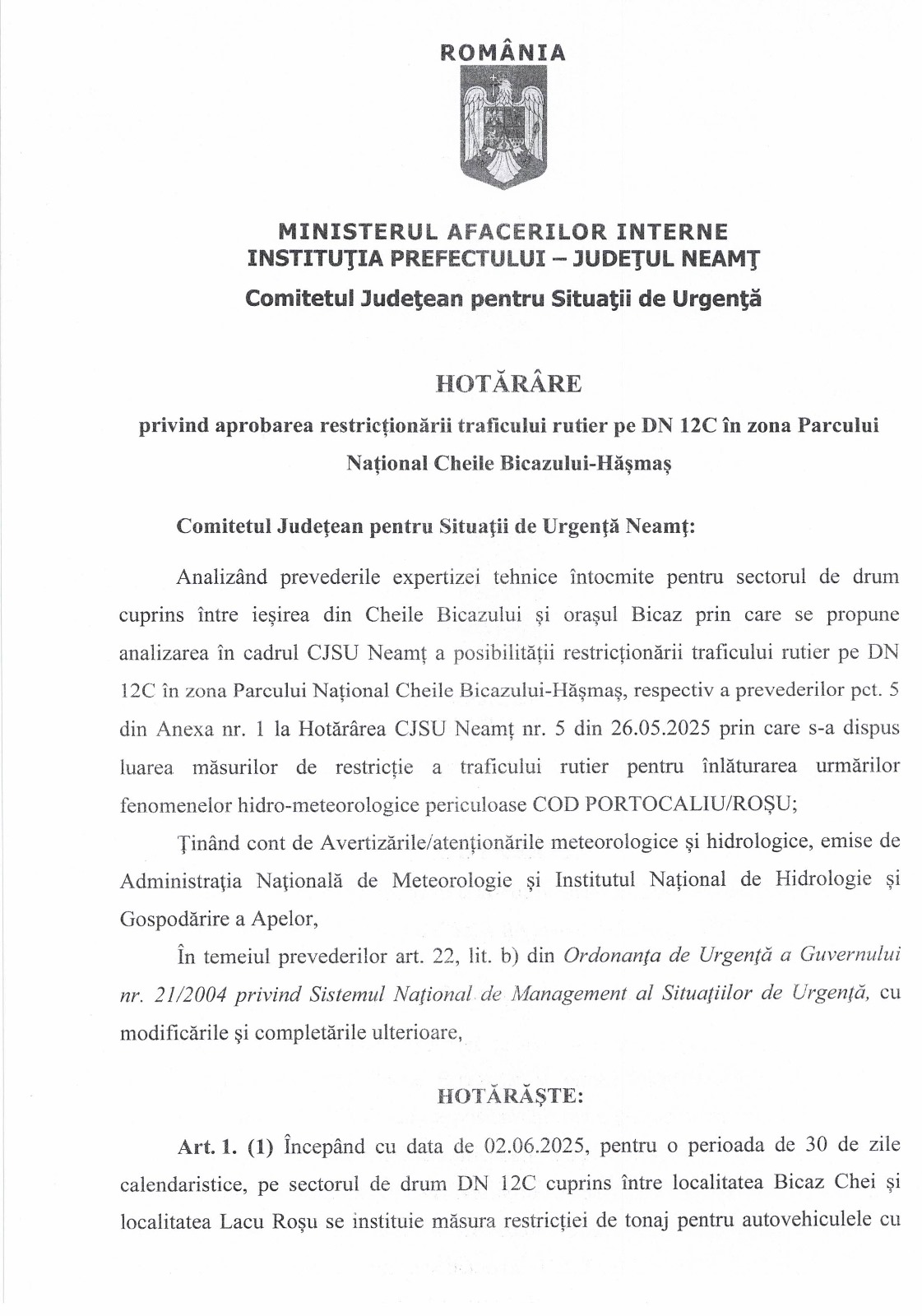 ⚠️ Pentru conformitate, atașăm hotărârea CJSU Neamț din 30.05.2025, precum și semnalizarea ce urmează a fi instituită pe sectorul de drum aafectat.