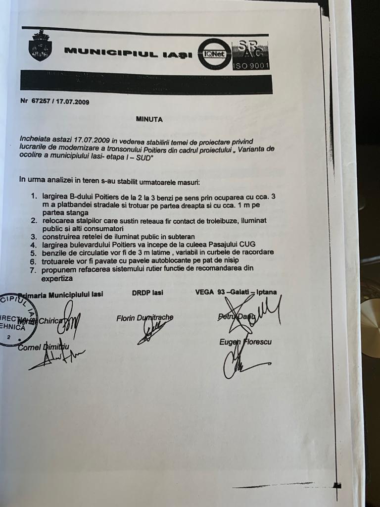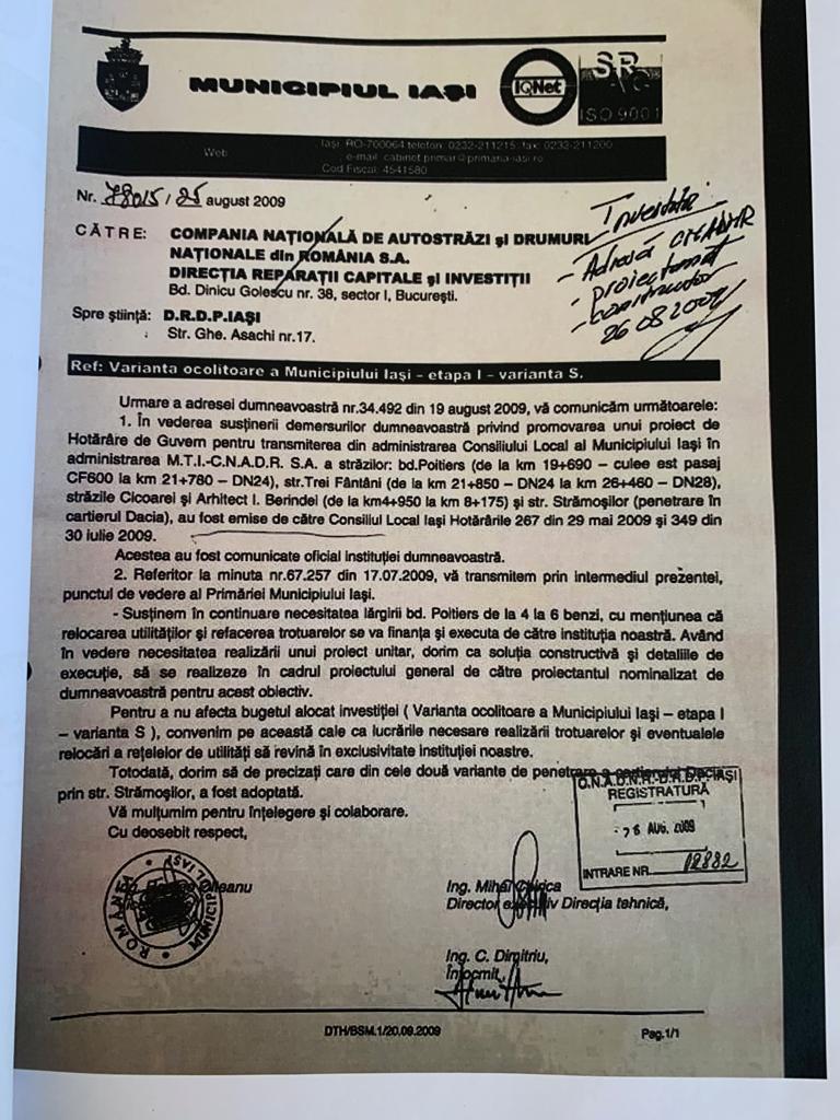 Or, în cazul Variantei de Ocolire – Sud, prin adresa 78015/25.08.2009, Primăria s-a angajat să pună la dispoziție traseul Selgros – B-dul Poitiers – Str. Trei Fântâni – intersecție cu DN 28 la dispoziția CNAIR, liber de sarcini, aceasta însemnând relocarea utilităților – apă, canalizare, telecomunicații și stâlpi de electricitate. „Susținem în continuare necesitatea lărgirii bd. Poitiers de la 4 la 6 benzi, cu mențiunea că relocarea utilităților și refacerea trotuarelor se va finanța și executa de către instituția noastră. (…) Pentru a nu afecta bugetul investiției (Varianta Ocolitoare a Municipiului Iași – Etapa I, Varianta S), convenim pe această cale ca lucrările necesare realizării trotuarelor și eventualele relocări a rețelelor de utilități să revină în exclusivitate instituției noastre”– extras din adresa nr. 78015/25.08.2009 a Primăriei Iași, semnată de dl Mihai Chirica, în calitate de director executiv al Direcției Tehnice. Acest angajament a fost readus în atenție în repetate rânduri de către DRDP Iași, dar și de către reprezentanții altor instituții, inclusiv de către președintele Consiliului Județean Iași, dl Maricel Popa, cărora le mulțumim pe această cale în susținerea demersului nostru.